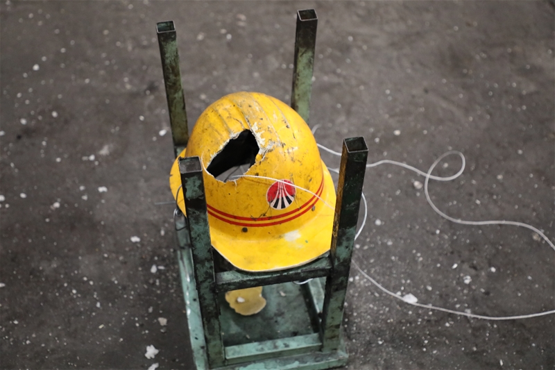 “安全體驗”之高空墜物,當(dāng)天車檢修工作大錘未按要求定置,從高空墜落,會是什么效果?該單位先后做了二次實驗。